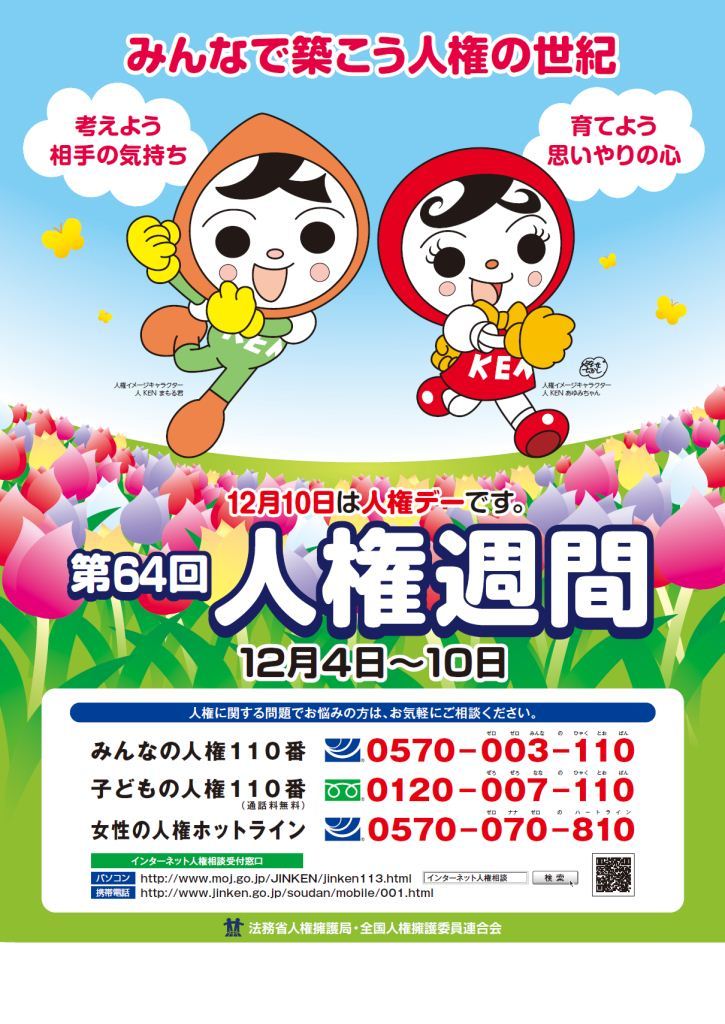 法務省と全国人権擁護委員連合会は、世界人権宣言が採択された翌年の昭和24年から毎年12月10日の「人権デー」を最終日とする1週間を人権週間と定め、人権尊重思想の普及高揚のため啓発活動を全国的に展開しています。