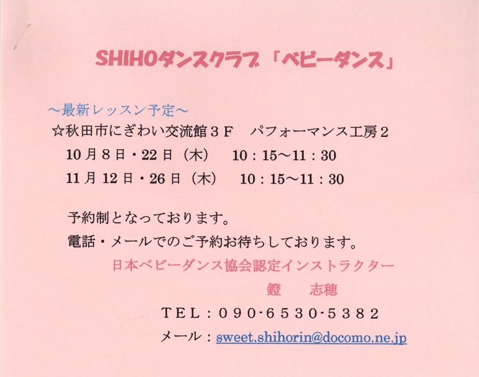 SHIHOダンスクラブ 「ベビーダンス」 期間:2015年10月08日 開催日:10月 8日・22日(木) 10:15~11:30 11月12日・26日(木) 10:15~11:30 ※予約制 会 場:3F パフォーマンス工房2 予約・問合せ:SHIHOダンスクラブ主宰 鐙 志穂 ☎ 090-6530-5382 ✉ sweet.shihorin@docomo.ne.jp