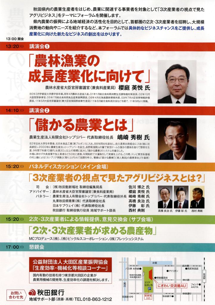 秋田県内の農業生産者をはじめ、農業に関連する事業者を対象として「3次産業者の視点で見たアグリビジネス」をテーマにフォーラムを開催されます。