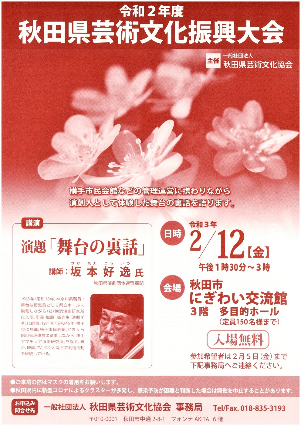 令和2年度 秋田県芸術文化振興大会 期間:2021年02月12日 開催日:2月12日(金) 時 間:午後1時30分~3時 会 場:3F 多目的ホール 入 場:無料 (定員150名様まで) 参加希望者は2月5日(金)まで下記事務局へご連絡ください。 申込・問合せ:一般社団法人 秋田県芸術文化協会 事務局 Tel/Fax 018-835-3193 〒010-0001 秋田市中通2-8-1 フォンテAKITA 6階