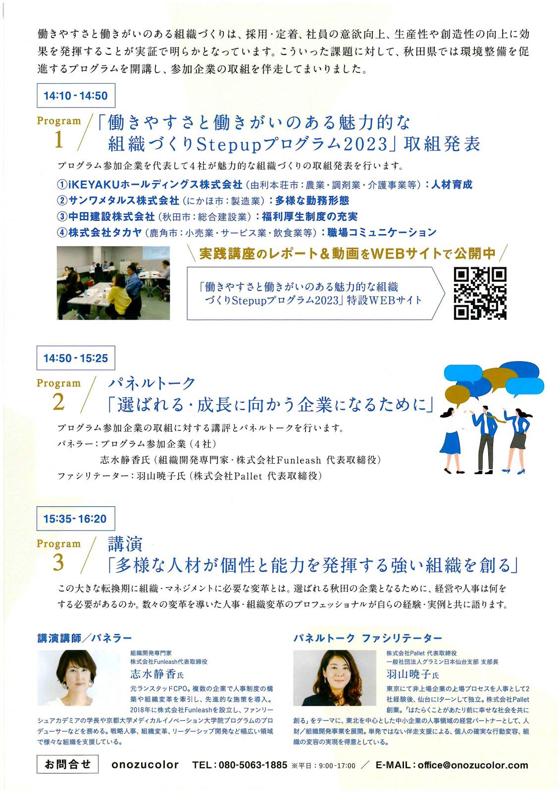 選ばれる・成長に向かう企業になるための組織づくりフォーラム 期間:2024年02月22日 開催日:2月22日(木) 時 間:14:00~16:40(開場13:30) 会 場:3階多目的ホール 申 込:事前申込制(チラシのQRコードより) 定員150名 オンライン参加可能 問合せ:onozuclor ☎080-5063-1885(平日9:00~17:00) ✉office@onozucolor.com