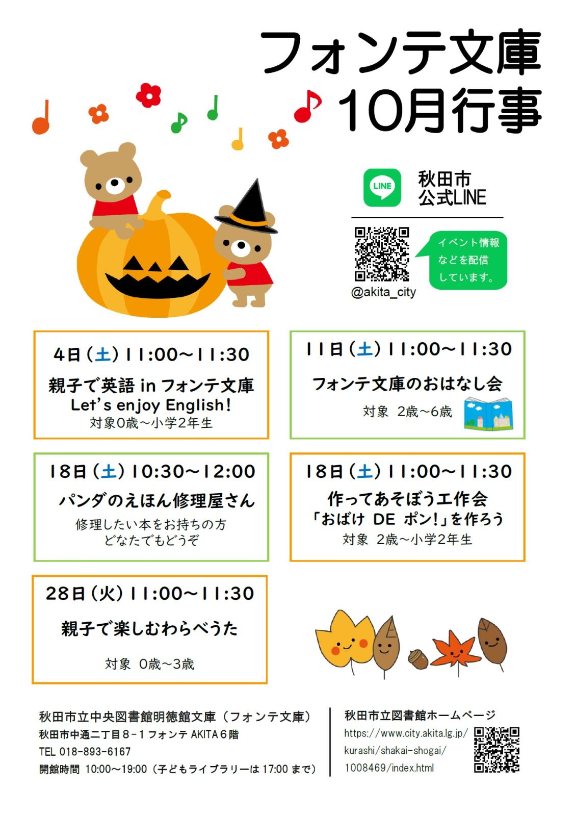 親子で英語 in フォンテ文庫 Let's enjoy English! 期間:2025年10月04日 英語での楽しいトーク、読み聞かせ、リズム遊びなど 開催日:10月4日(土) 時 間:11:00~11:30 会 場:フォンテAKITA 6階 フォンテ文庫 対 象:0歳~小学2年生 問合せ:018-893-6167