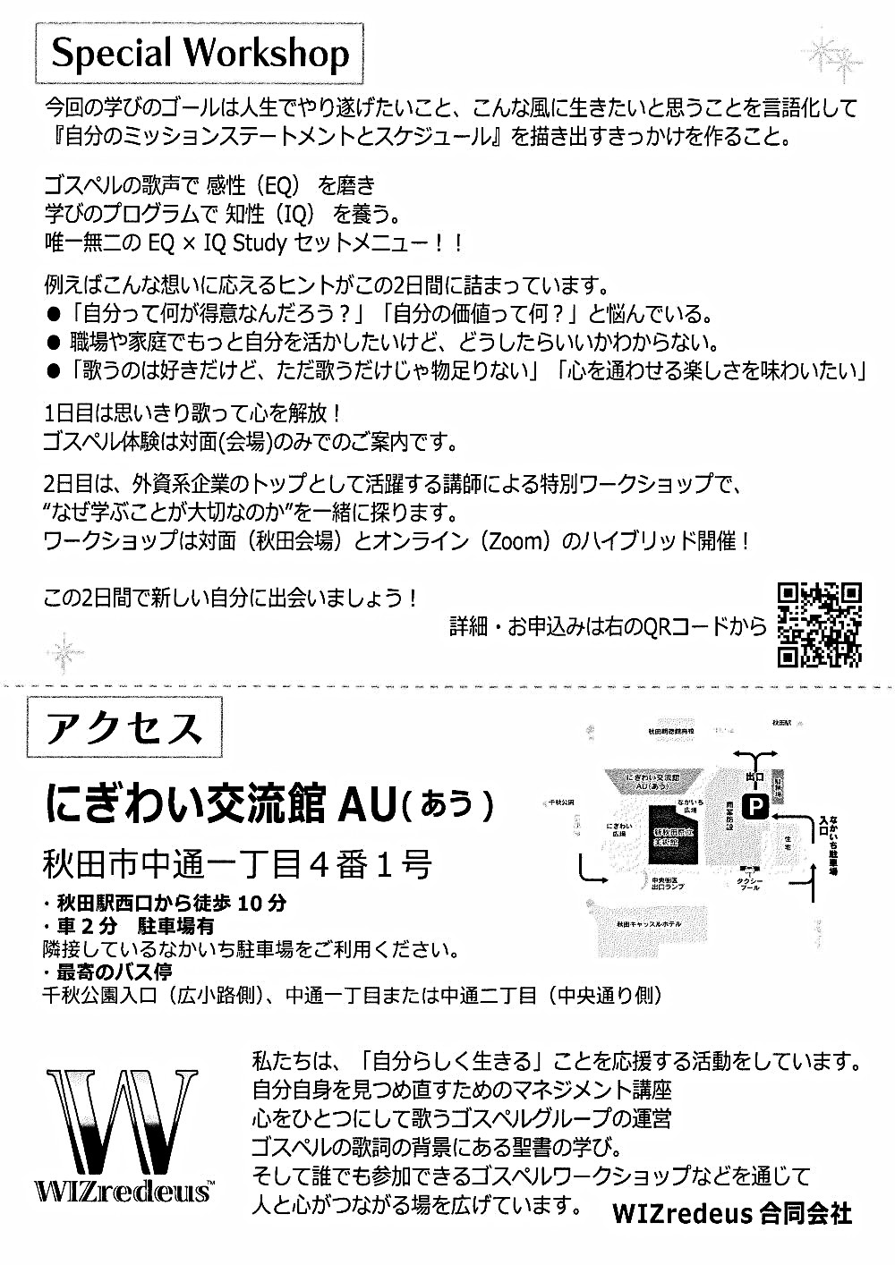 WIZ Gospel Choir スペシャルイベント! ゴスペル✕学び 期間:2025年11月01日 ~ 2025年11月02日 開催日:11月1日(土)・11月2日(日) 時 間:11月1日(土) 13:30~16:30 11月2日(日) 時間は申込画面で選べます 会 場:11月1日(土) ミュージック工房1 11月2日(日) 4階研修室 参加費:5,000円 ※チラシをご確認ください 申込締切:10月31日(金) 申込方法:チラシのQRコード、または電話でお申込みください 問合せ・予約:WIZredeus合同会社 ☎070-8570-1899