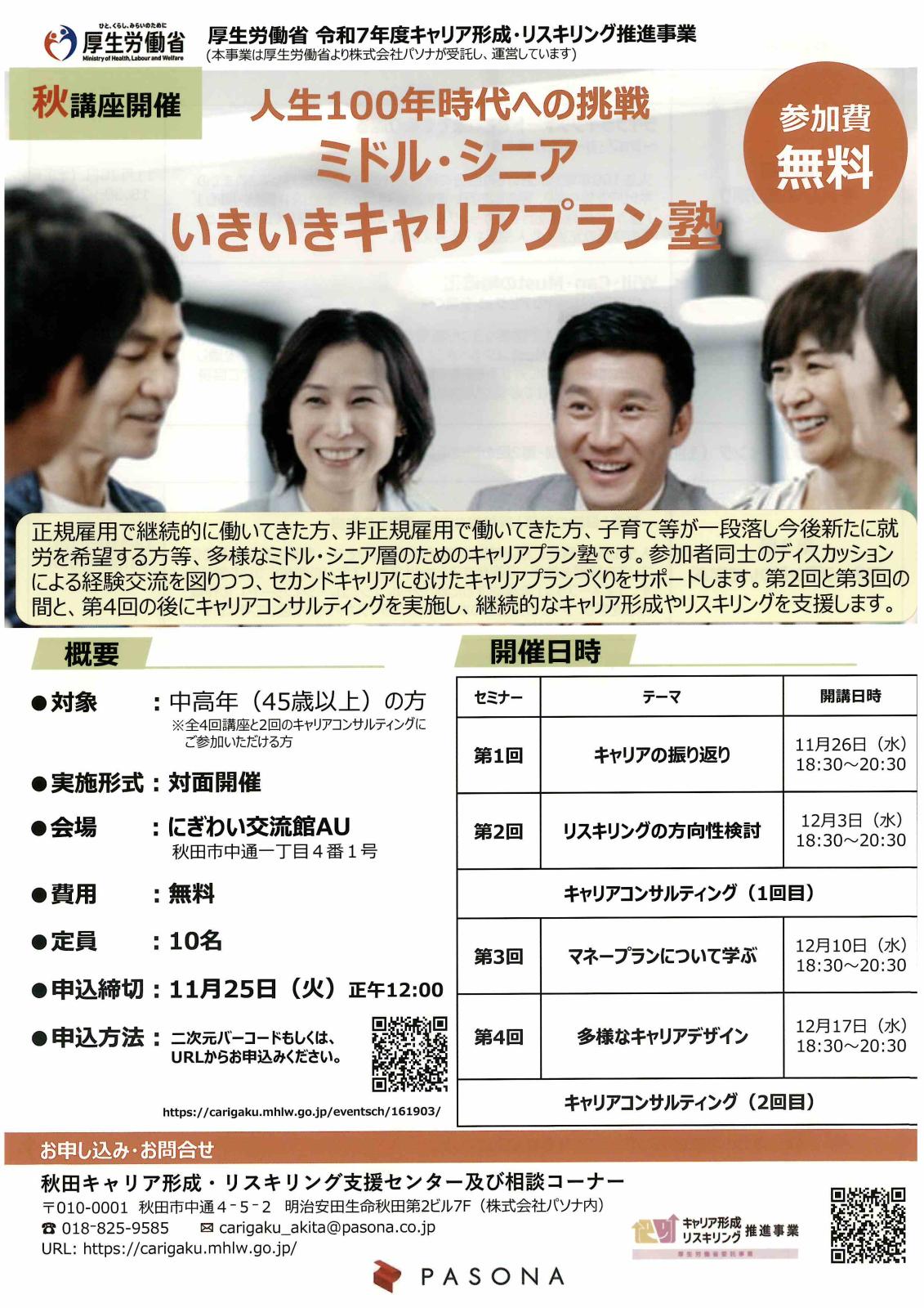 - 問合せ:秋田キャリア形成・リスキリング支援センター及び相談コーナー