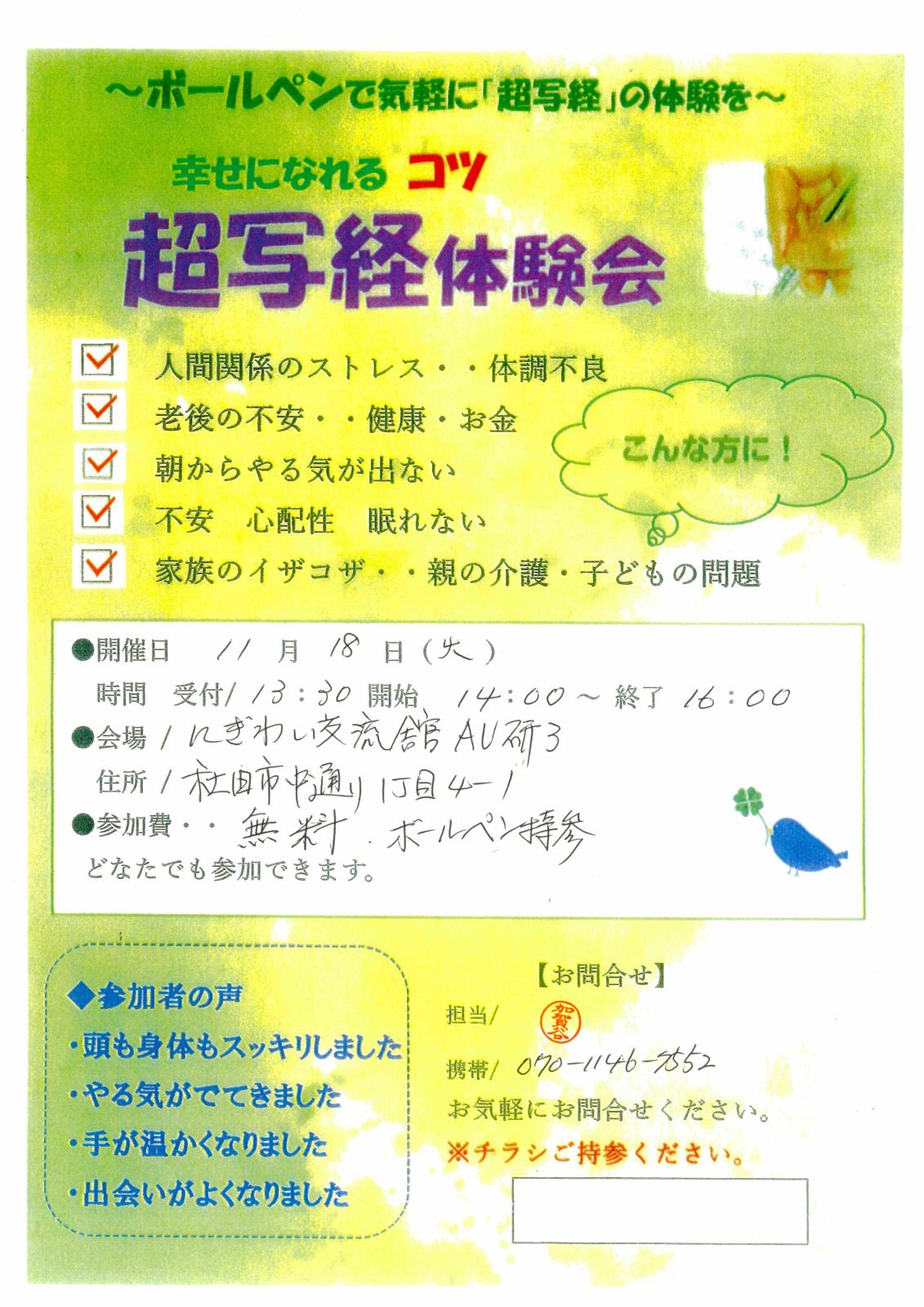 超写経体験会 期間:2025年11月18日 開催日:11月18日(火) 時 間:受付13:30 開始14:00~終了16:00 会 場:4F 研修室3 参加費:無料 ボールペン持参 問合せ:担当/加賀谷 携帯/070-1146-7552