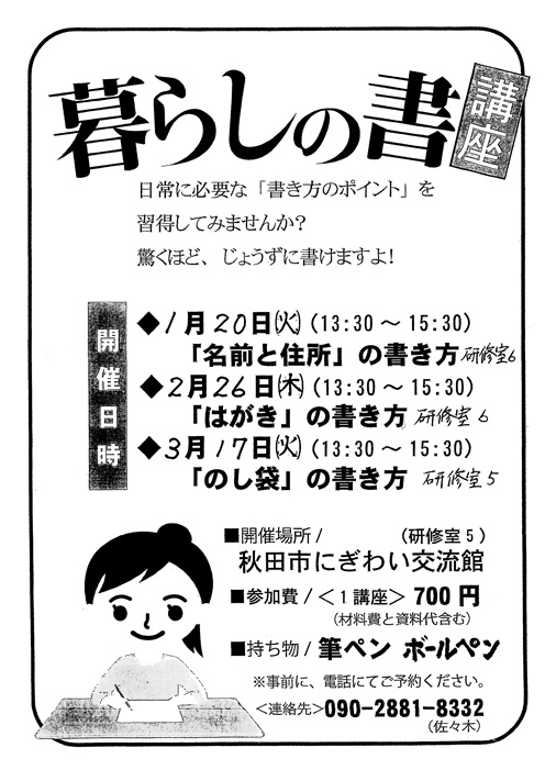 暮らしの書講座 期間:2026年01月20日 期間:2026年02月26日 期間:2026年03月17日 開催日:1月20日(火)「名前と住所」の書き方 2月26日(木)「はがき」の書き方 3月17日(火)「のし袋」の書き方 時 間:13:30~15:30 会 場:研修室6(1月20日・2月26日) 研修室5(3月17日) 参加費:700円(材料代と資料代含む) 持ち物:筆ペン、ボールペン 連絡先:090-2881-8332(佐々木) ※事前に、電話にてご予約ください
