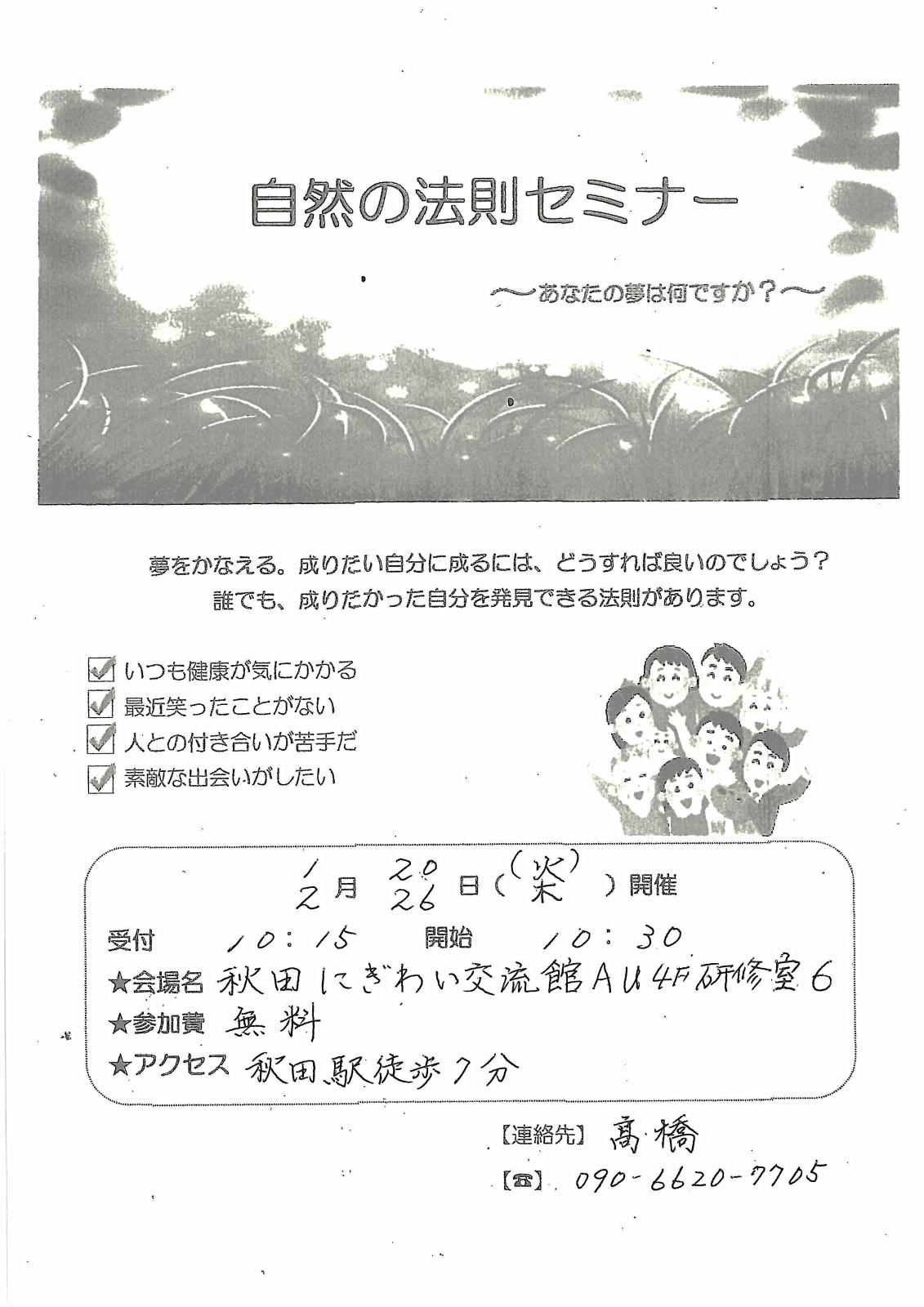 自然の法則セミナー~あなたの夢は何ですか?~ 期間:2026年01月20日 期間:2026年02月26日 開催日:1月20日(火) 2月26日(木) 時 間:10:30 (受付10:15) 会 場:秋田市にぎわい交流館 参加費:無料 連絡先:090-6620-7705(髙橋)