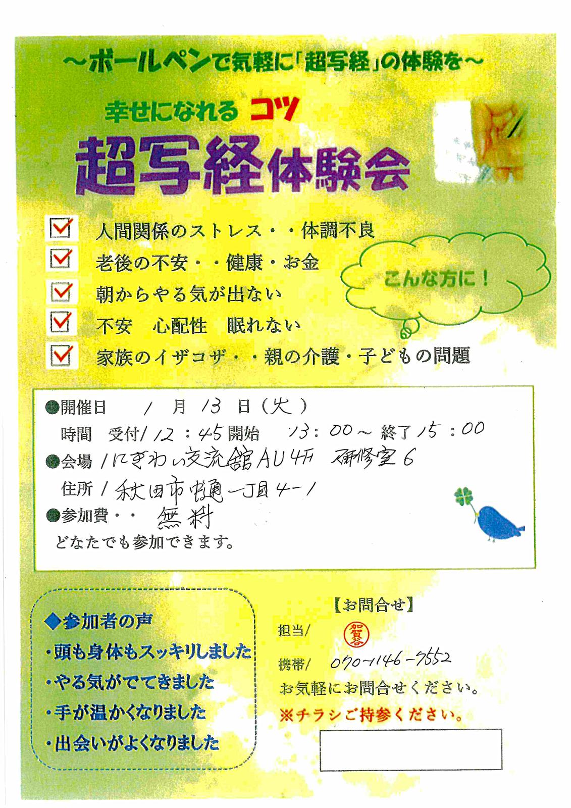 幸せになれるコツ 超写経体験会 期間:2026年01月13日 開催日:1月13日(火) 時 間:13:00~15:00 (12:45受付) 会 場:4F 研修室6 参加費:なし 持ち物:ボールペン(※チラシご持参ください) 連絡先:加賀谷(070-1146-7552)