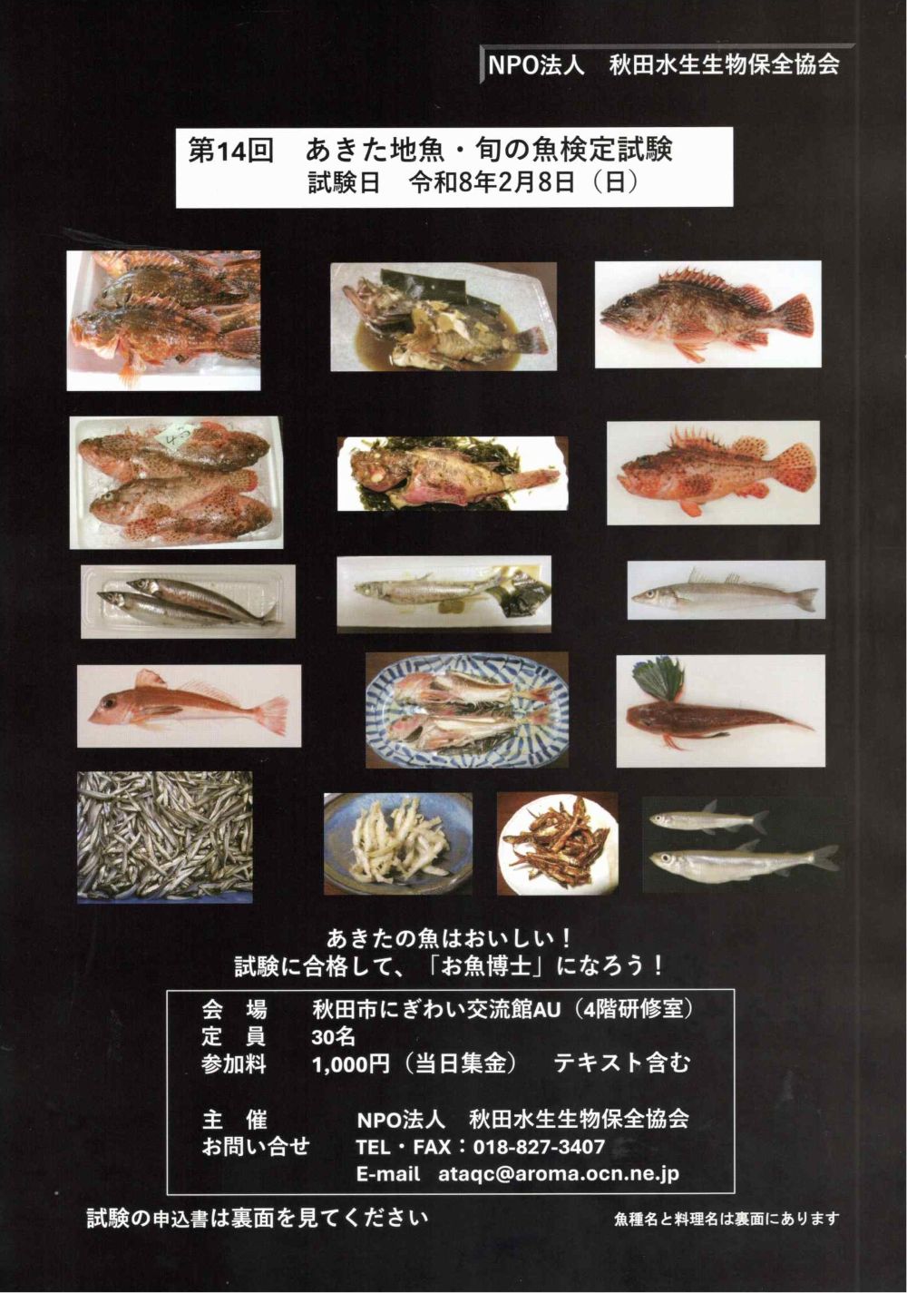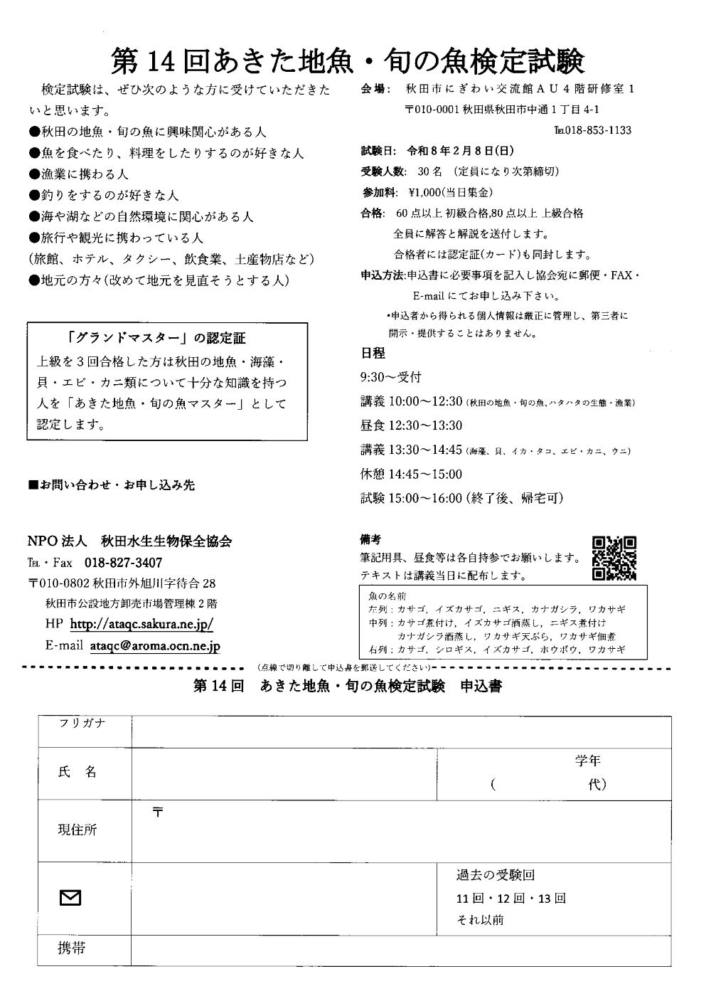 第14回 あきた地魚・旬の魚検定試験 期間:2026年02月08日 開催日:2月8日(日) 会 場:4F研修室1 定 員:30名(定員になり次第、締め切りになります) 参加料:1,000円(当日集金) 主 催:NPO法人秋田水生生物保全協会 問合せ:TEL・FAX 018-827-3407 ✉ataqc@aroma.ocn.ne.jp 申込方法:申込書に必要事項を記入し、郵送・FAXまたはメールにてお申込みください。