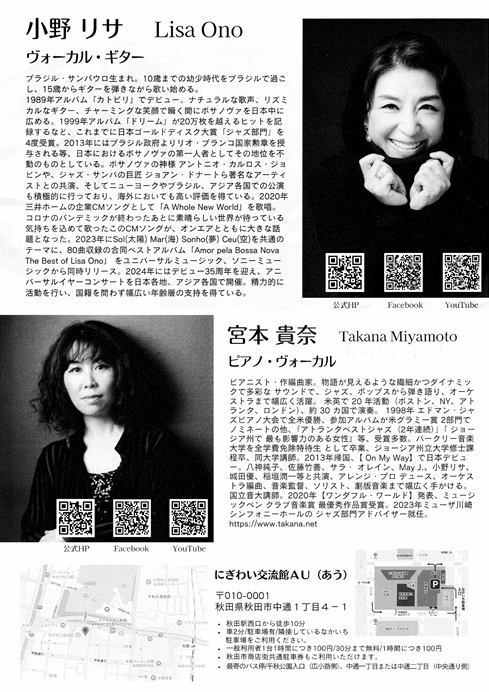小野リサ×宮本貴奈 DUOコンサート2026 期間:2026年05月10日 開催日:5月10日(日) 時 間:OPEN/15:30 START/16:00 会 場:多目的ホール 入場料:(全席自由)前売り6,000円 当日6,500円 チケット:~WEBチケット販売~ 【チケットぴあ】Pコード320808 【イープラス】 【ローソンチケット】Lコード23192 ~店頭チケット販売~ 【THE CAT WALK】018-865-6699 【さきがけNewsCafe】018-874-8171 主催、問合せ:THE CAT WALK/018-865-6699