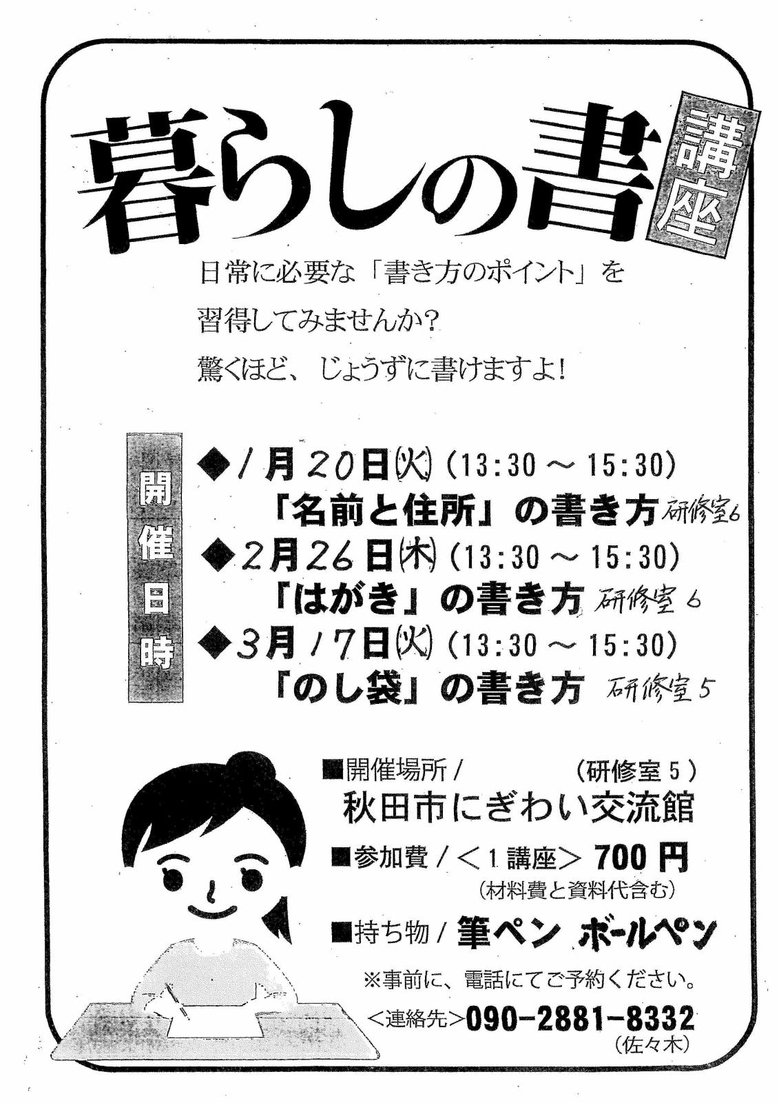 暮らしの書講座 期間:2026年04月16日 期間:2026年05月14日 期間:2026年06月11日 開催日:4月16日(木)「名前と住所」の書き方 5月14日(木)「はがき」の書き方 6月11日(木)「のし袋」の書き方 時 間:13:30~15:30 会 場:研修室6 参加費:700円(材料費と資料代含む) 持ち物:筆ペン、ボールペン 連絡先:090-2881-8332(佐々木) ※事前に、電話にてご予約ください